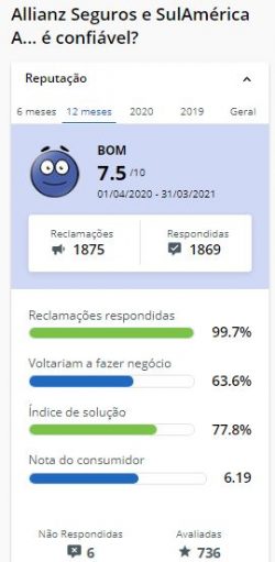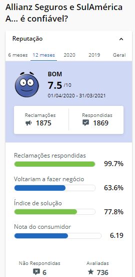 Entre as opções, você pode consultar o site do Reclame Aqui. Por exemplo, no período de 01/04/2020 a 31/03/2021, a Allianz Seguros e SulAmérica Auto, Residencial e Condomínio foi classificada como “Bom”.